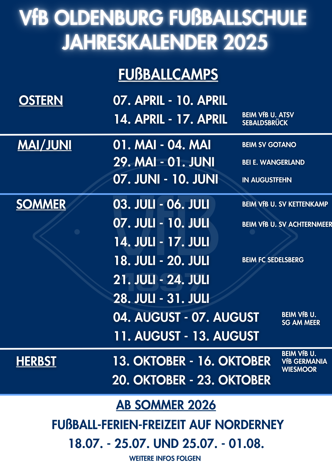Neben Feriencamps, bieten wir unsere Heimspielcamps an. Link für weitere Infos und zur Anmeldung Heimspielcamps - VfB Oldenburg (vfb-oldenburg.de)